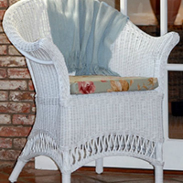 Beautiful rattan conservatory chair in gloss white with black cushioning.