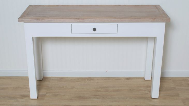 Stunning combination of two tone teak wash top and white painted mahogany console. Perfect addition to anyone that loves that elegant, relaxed coastal vibe.